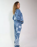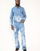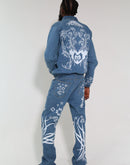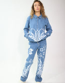 The jacket is detailed with an open zipper front and a Peter-Rabbit style collar, combining classic denim structure with a contemporary artistic edge. The matching trumpet pants continue the all-over DTS print, creating a unified, expressive denim look with a standout silhouette.