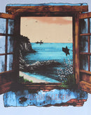 Crafted from 100% soft stonewashed cotton, this tee offers a relaxed vintage feel with premium comfort. The front showcases a digital print of a window view overlooking the ocean, mountains, and a vibrant sunset — framed with colorful flowers and traditional fishermen in the village scene of Cenu.