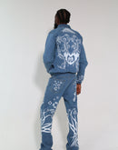The jacket features DTS-style pattern prints that blend M-shaped motifs into floral-like formations across the front and back, symbolizing Maison Makeeva’s identity through art and form. A front zipper closure and Peter Rabbit-style collar lend a contemporary twist to the classic denim silhouette.
